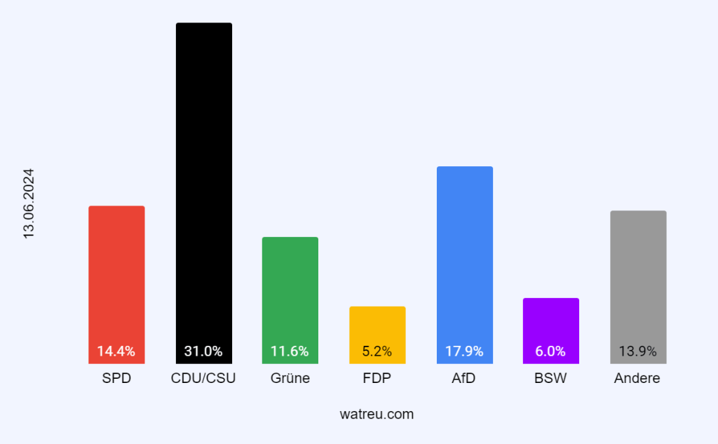 Die CDU ist sehr stark dabei, und übertrifft die 30er Grenze. Die AfD würde 2. stärkste Partei sein, mit sicherem Abstand zum drittem. Die SPD wäre mit 14.4% 3. Platz. Die Grüne wäre sehr schwach, und könnte nicht einmal mehr die 12% einholen. Das BSW würde sich als neue Partei sehr gut schlagen, und sogar stärker als die Regierungspartei FDP sein, welche den Einzug in den Bundestag nur knapp schaffen würde. Sonstige Parteien kommen auf 13.9% zusammen.