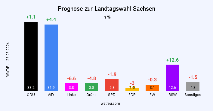 In Thüringen ist die einst stärkste politische Kraft, Die Linke, auf den vierten Platz abgerutscht. Mit einem dramatischen Verlust von 17,2 Prozentpunkten kommt sie nur noch auf 13,8%. Die AfD hingegen hat stark zugelegt und erreicht laut Prognose 31%, genau so viel wie Die Linke bei der letzten Wahl. Damit gewinnt die AfD 7,6 Prozentpunkte hinzu. Die CDU bleibt stabil bei 23,1%, was einem minimalen Zuwachs von 0,1 Prozentpunkten entspricht. Die SPD kämpft mit 5,7% um den Einzug in den Landtag, nachdem sie 2,5 Prozentpunkte eingebüßt hat. Die Grünen erleben in Thüringen mit nur 1,6% ihr bisher schwächstes Ergebnis seit ihrer Gründung und verlieren 3,6 Prozentpunkte. Die FDP erreicht nur noch 3,3% und verfehlt damit sicher den Einzug in den Landtag, was einem Verlust von 1,7 Prozentpunkten entspricht. Das neu gegründete BSW gewinnt stark hinzu und erreicht 17,4%, ein Plus, das in etwa den Verlusten der Linken entspricht. Sonstige Parteien kommen zusammen auf 4,1%, was einen Rückgang von 1,4 Prozentpunkten bedeutet.