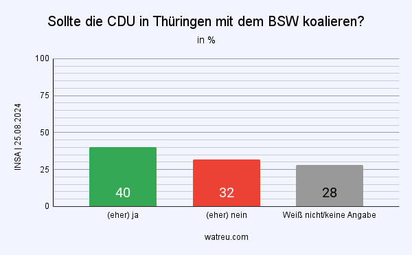 40% der Befragten in Thüringen sprechen sich dafür aus, dass die CDU mit dem BSW koalieren sollte, während etwa ein Drittel dieser Meinung widerspricht.