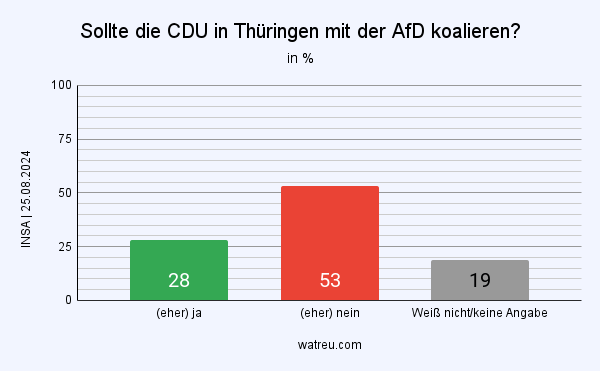 In Thüringen befürworten 2% weniger der Befragten eine Koalition der CDU mit der AfD im Vergleich zu Sachsen. Mehr als die Hälfte der Befragten sind dagegen.