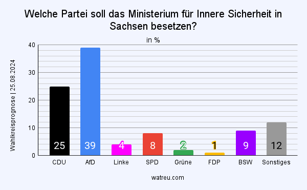 Beinahe zwei Fünftel der Befragten (39%) wünschen sich, dass die AfD das Ministerium für Innere Sicherheit übernimmt. Ein Viertel (25%) bevorzugt die CDU in diesem Ministerium. 8% der Befragten möchten die SPD dort sehen, während 9% das BSW favorisieren. Die Linke (4%), die Grünen (2%) und die FDP (1%) erhalten jeweils weniger als 5% Zustimmung. 12% der Befragten möchten, dass keine der genannten Parteien das Ministerium besetzt.