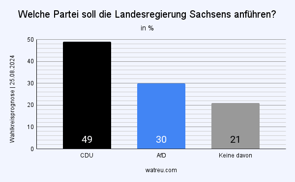In Sachsen wünschen sich 49% der Befragten eine Landesregierung unter Führung der CDU, was der Zufriedenheit mit dem amtierenden Ministerpräsidenten entspricht. 30% befürworten eine Regierung unter der AfD, während 21% keine der beiden Parteien bevorzugen.