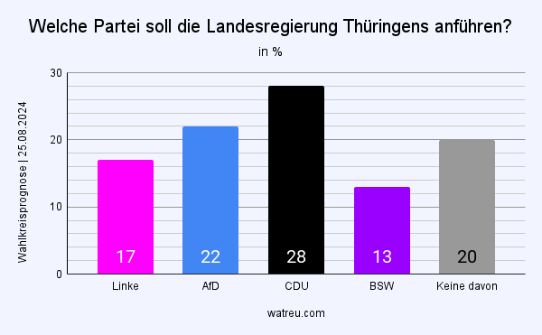 In Thüringen möchten nur 17%, dass die Linke weiterhin die Landesregierung anführt. 13% sprechen sich für das neu gegründete BSW an der Spitze aus. 22% favorisieren eine von Björn Höcke geführte Landesregierung. Die größte Unterstützung erhält jedoch Mario Voigt, den 28% als Ministerpräsidenten sehen möchten.
