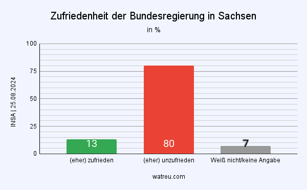 In Sachsen ist die Zustimmung zur Regierung extrem niedrig; nur 13% der Befragten befürworten die derzeitige Landesregierung. 80% sind (eher) unzufrieden, und 7% machten keine Angabe oder gaben „Weiß nicht“ an.