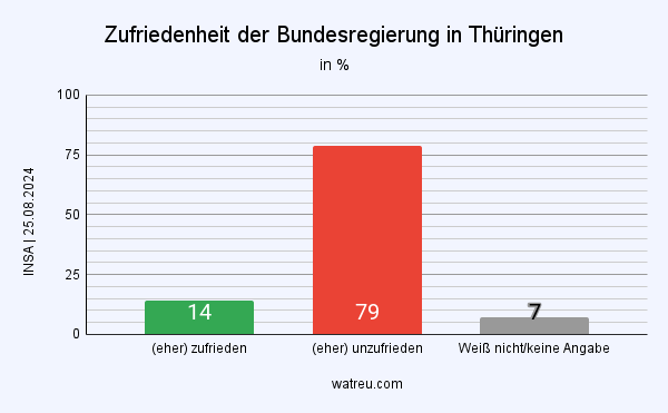 In Thüringen zeigt sich ein ähnliches Bild: Etwa 79% der Befragten sind (eher) unzufrieden mit der aktuellen Regierung, während nur 14% (eher) zufrieden sind.