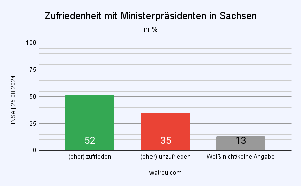 In Sachsen ist die Zufriedenheit mit dem CDU-Ministerpräsidenten Michael Kretschmer relativ hoch; mehr als die Hälfte der Befragten sind (eher) zufrieden mit ihm. Etwa ein Drittel sind (eher) unzufrieden, und 13% gaben keine Angabe.
