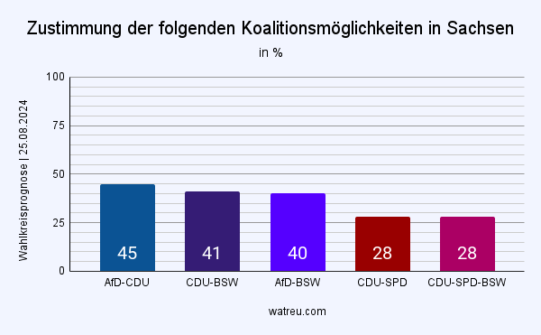 In Sachsen ist die beliebteste Koalition die AfD-CDU, die 45% Zustimmung erhält. Dicht dahinter folgt die Koalition CDU-BSW mit 41% Zustimmung. Eine ähnliche Unterstützung genießt die Koalition AfD-BSW mit 40%. Weniger beliebt ist die Große Koalition, die voraussichtlich keine Mehrheit erreichen würde, sowie die Dreierkoalition CDU-BSW-SPD, die jeweils 28% Zustimmung erfährt.